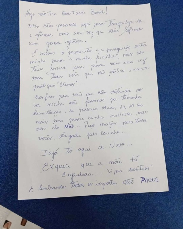 A carta foi publicada no perfil oficial da influenciadora no Instagram e ela faz um desabafo dizendo que sua família sofre preconceito, isso porque sua mãe, Solange Bezerra, também foi presa, mas levada para um hospital depois de passar mal.
