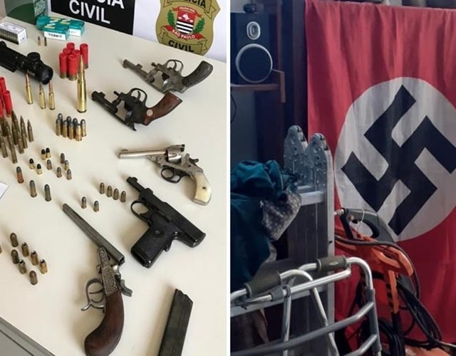 Ainda durante a busca pela residência, os policiais também encontraram uma bandeira nazista e fotos de Hitler. O suspeito disse que era colecionador, mas não tinha registros.