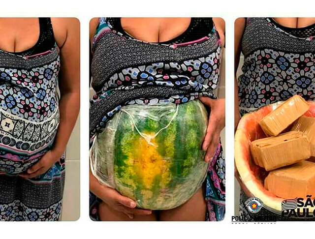 Uma mulher de 38 anos foi presa com 2 kg de pasta base de cocaína escondidos em uma barriga falsa em Guaratinguetá (SP). Segundo a polícia, a mulher usou uma melancia para forjar a barriga de grávida e escondia os entorpecentes dentro da fruta. O flagrante foi neste domingo (29).