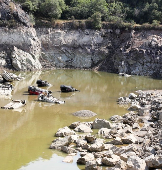 A diminuição do nível de água em uma pedreira desativada na cidade de Salto de Pirapora revelou carros que estavam submersos.