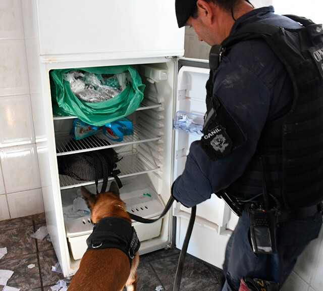 Segundo informações, os guardas realizavam o patrulhamento pelas ruas do bairro e notaram suspeitos correndo em direção à uma viela próximo da rua Bolívia. Com a indicação do cão Zeus, os guardas Sérgio Luiz, Neves e De Souza foram averiguar uma casa que estava toda aberta e desocupada. Em um dos cômodos, o cão farejou uma geladeira que continha quase 10 kg de drogas entre maconha, crack e lança perfume. Ninguém foi preso.