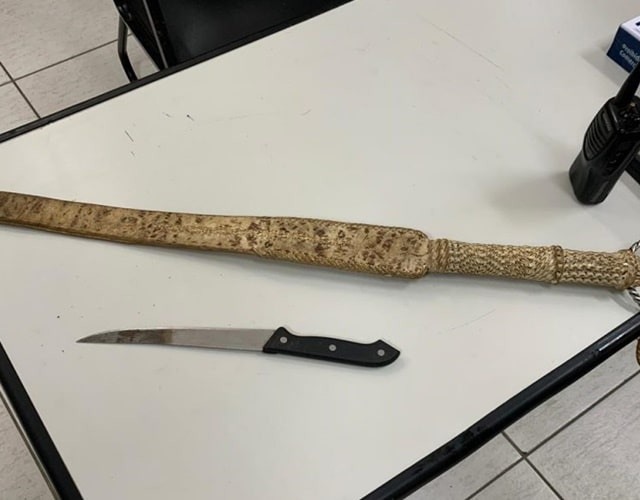 Chegando ao local o senhor se mostrou excessivamente alterado, portando, ainda uma faca (arma branca) e um chicote.