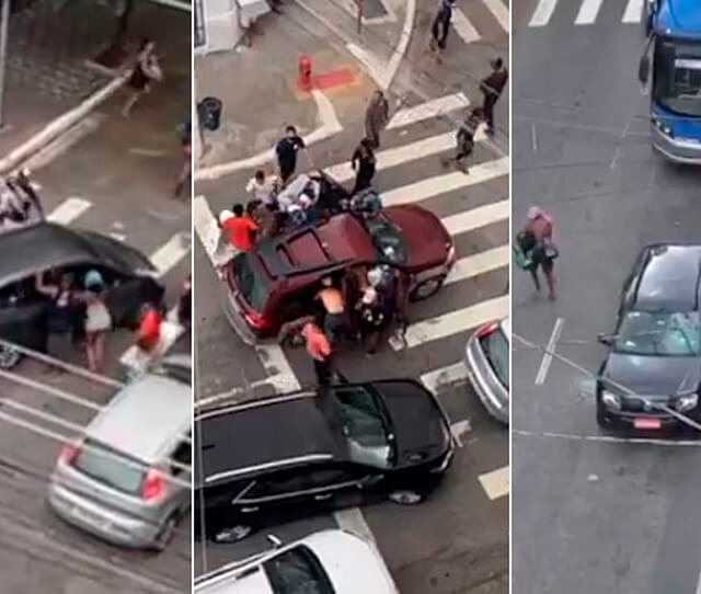 Ao menos seis veículos foram atacados no arrastão, segundo as imagens. Motoristas chegaram a subir na calçada com os carros para fugir dos criminosos durante a ação. O tráfego estava congestionado no trecho no momento do arrastão.