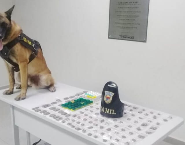O cão Zeus encontrou durante as buscas, 149 porções de maconha e 25 frascos de lança-perfume.