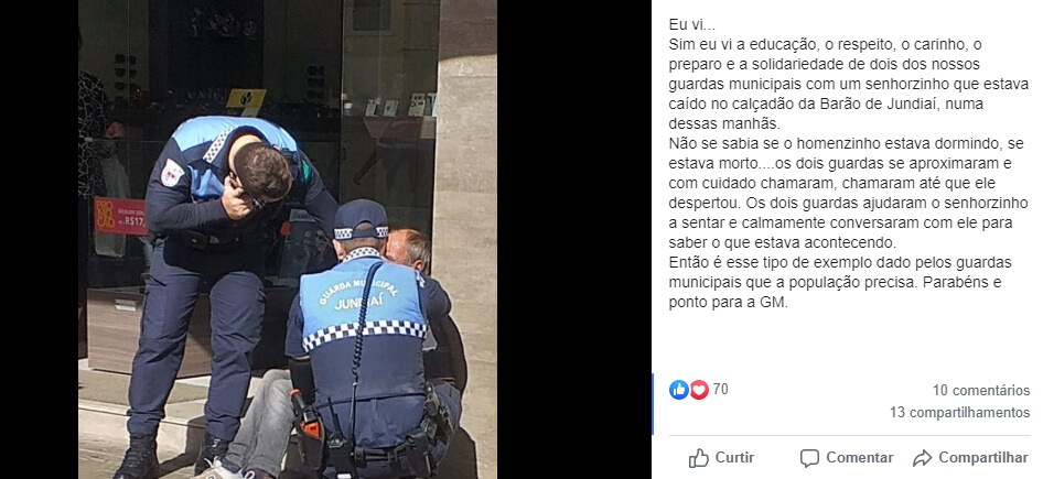 Ainda no relato, ela elogia esse tipo de atitude e todo preparo da Guarda Municipal de Jundiaí (GMJ). “Sim, eu vi a educação, o respeito, o carinho e a solidariedade de dois dos nossos guardas municipais com um senhorzinho, que estava caído no calçadão”, ressaltou.