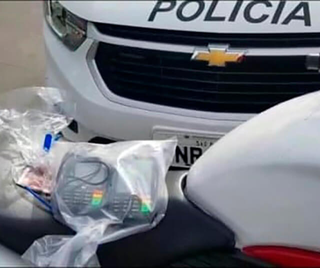 Uma bolsa com duas máquinas de cartão de crédito, celular, dinheiro e cartão foi apreendida junto ao suspeito.