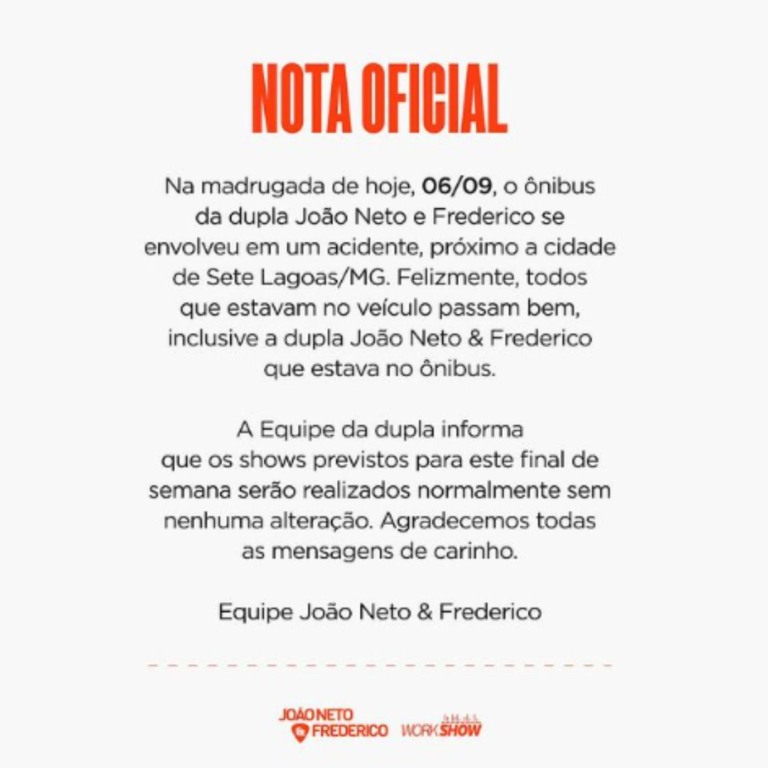 Na madrugada desta sexta-feira (6), o ônibus da dupla sertaneja João Neto e Frederico se envolveu em um acidente no km 453 da BR-040, em Caetanópolis, Minas Gerais. As informações foram confirmadas pela Polícia Rodoviária Federal (PRF).