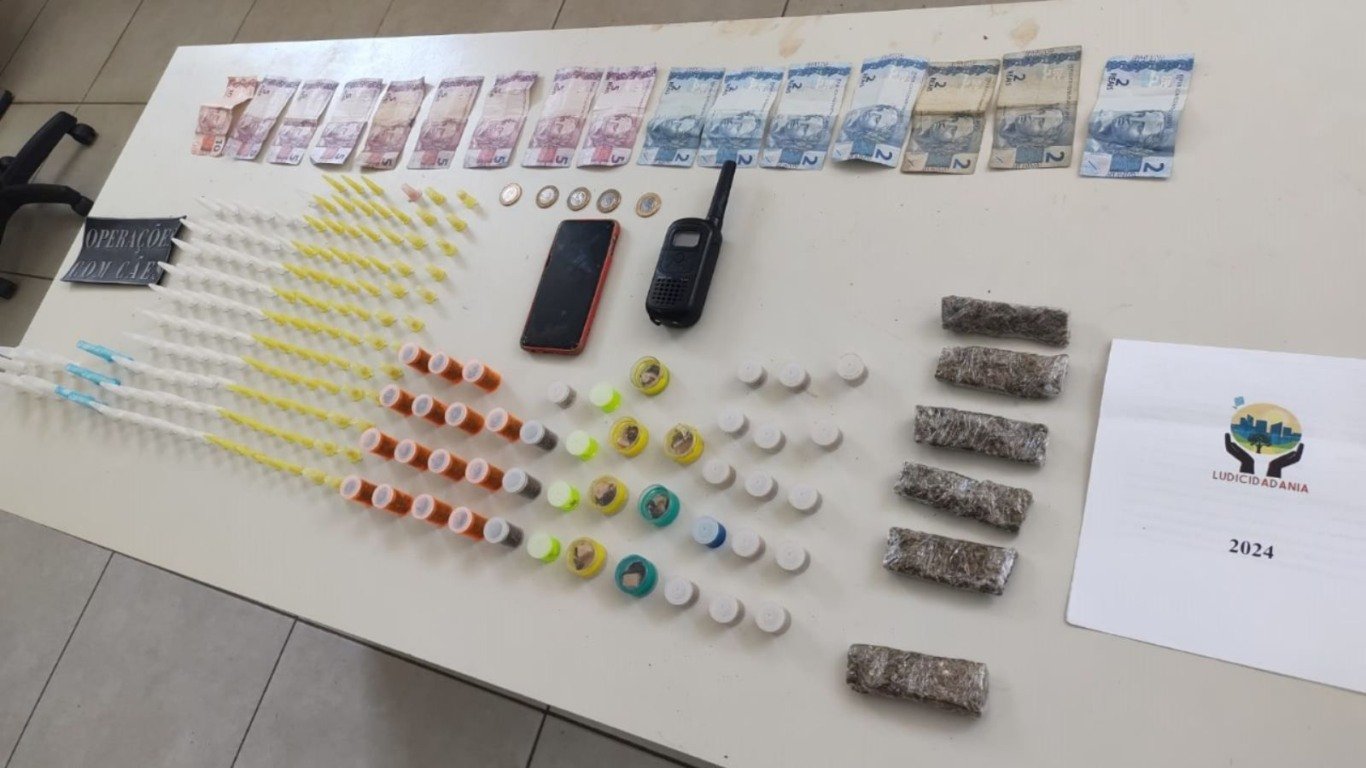 Com o adolescente foram encontrados quase 500 porções de drogas, incluindo crack, maconha e ice (uma droga sintética), além de cédulas totalizando 64 reais. Também foram apreendidos um celular e um rádio comunicador. A ocorrência foi registrada na Central de Flagrantes, onde as drogas foram apreendidas.