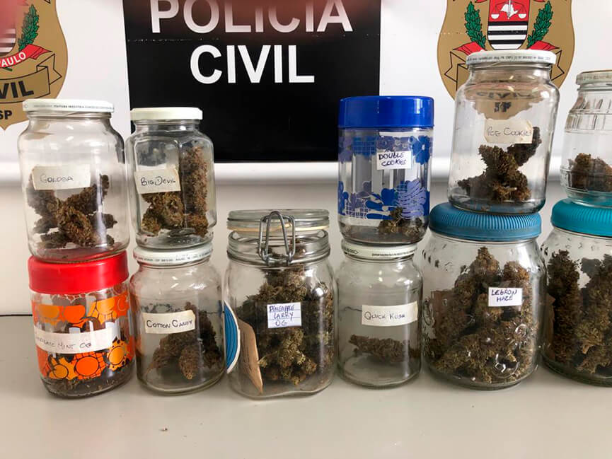Também foram achados 28 frascos de vidro com maconha em fase de secagem, pesando 10 quilos no total. Segundo informações da DIG, os potes possuíam rótulos com indicação do tipo da erva, “sabor” e outras características. Foram apreendidos também 20 embalagens com sementes importadas, além de 32 embalagens usadas, indicando que já haviam sido plantadas.