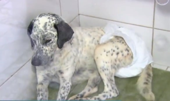 Depois de três dias, o terceiro cão foi encontrado, escondido na mata, com ferimentos ainda mais graves que os dois primeiros. A veterinária afirma que a gravidade da contaminação, por causa da demora no atendimento, pode ser fatal para o animal.