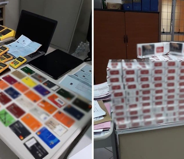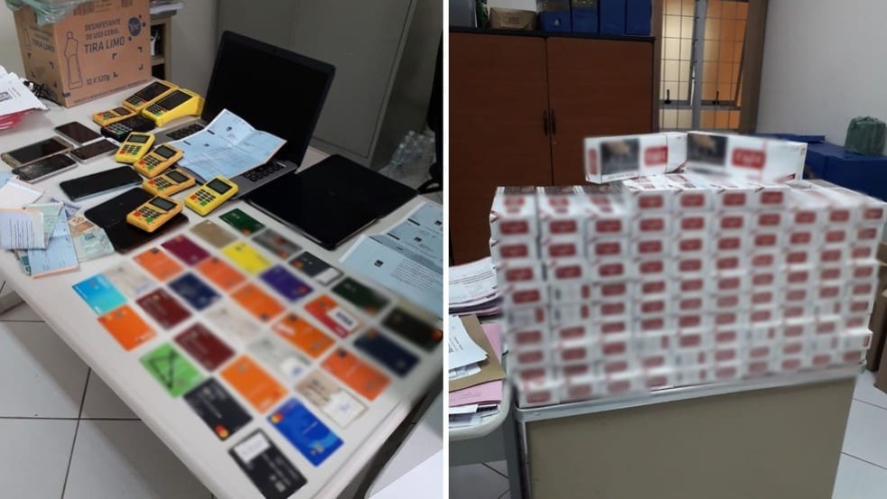 Ao todo, foram apreendidos mais de 50 cartões de créditos, cheques, dinheiro e celulares, além de quase dois mil maços de cigarro e máquinas de cartões.