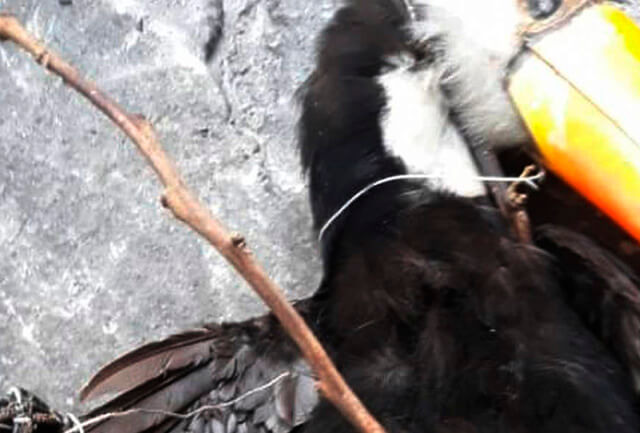 Em Corumbá, no Pantanal sul-mato-grossense, um tucano foi mais uma vítima, morta degolada por uma linha de cerol. O acidente aconteceu em uma serralheria, local em que um funcionário encontrou o animal já sem vida, no alto de um pé de laranja com a linha enrolada no pescoço e um ferimento.