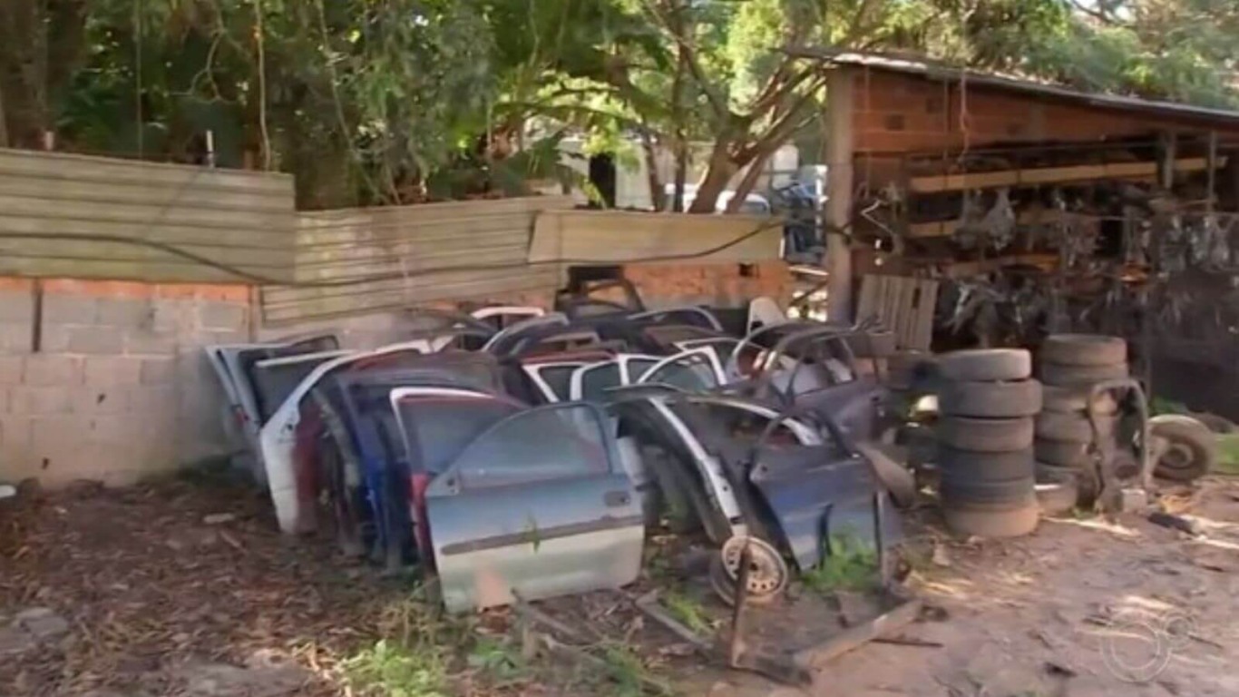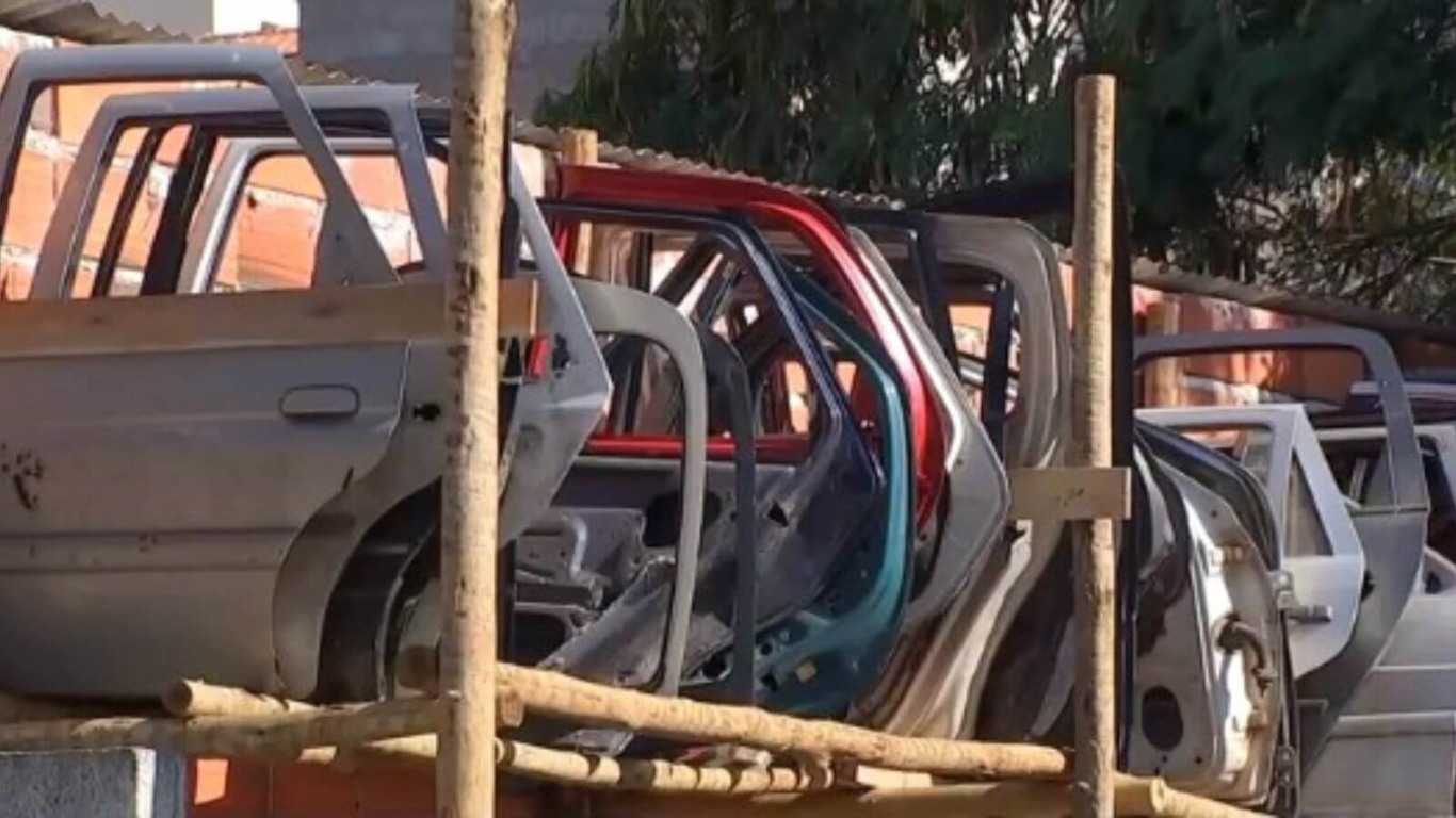 - Cinco veículos desmontados em partes como capôs, para-lama, câmbio e motores.