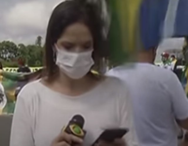 Uma apoiadora do presidente Jair Bolsonaro deu uma bandeirada na cabeça de uma repórter da BandNews TV durante ato a favor do governo em frente ao Palácio do Planalto neste domingo (17).