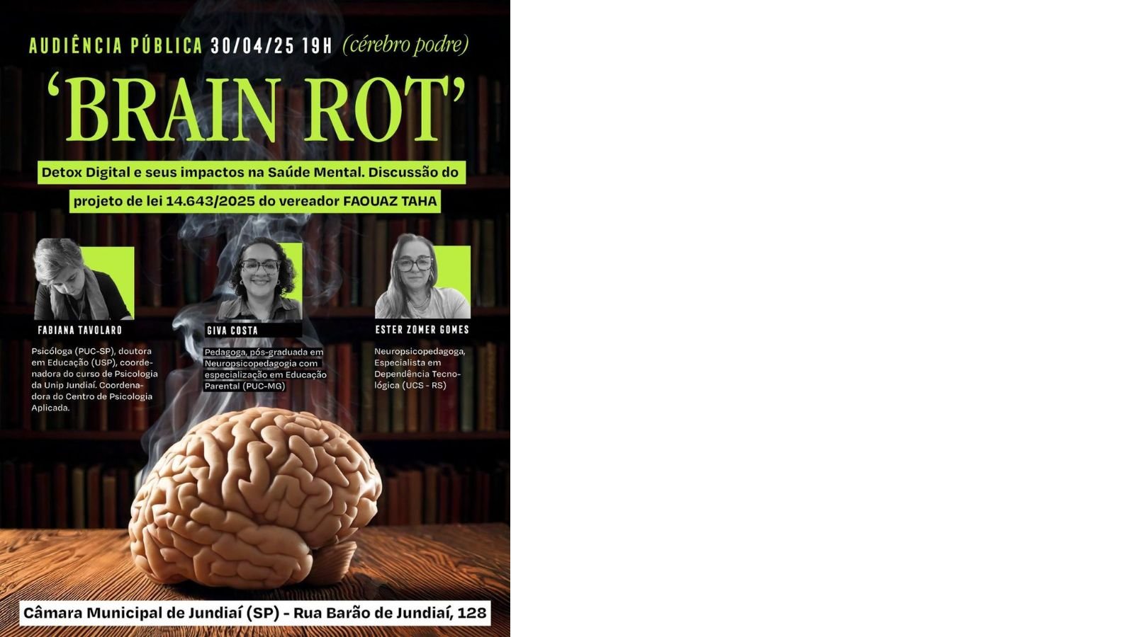 A Câmara Municipal de Jundiaí promove nesta quarta-feira, 30 de abril, às 19h, uma audiência pública para discutir os perigos do uso excessivo de telas e o fenômeno conhecido como ‘Brain Rot’ — ou “cérebro podre”. A iniciativa é do vereador Faouaz Taha, autor da lei do Detox Digital, que propõe a ampliação da legislação para incluir o novo tema. O evento é gratuito e aberto ao público.