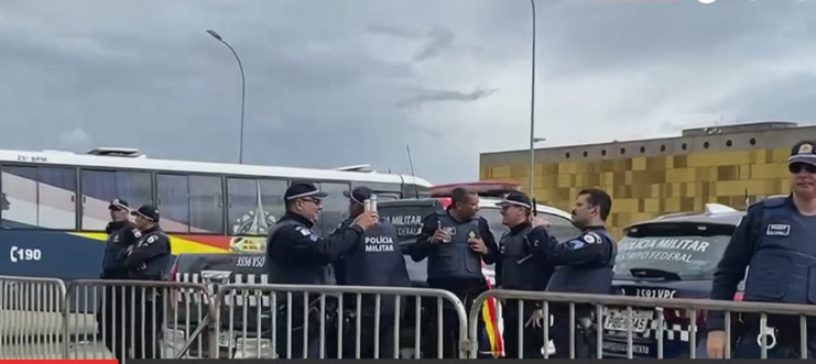 Enquanto os terroristas invadem e destroem prédios federais da Praça dos Três Poderes, policiais são flagrados no local, de braços cruzados, e tirando fotos.