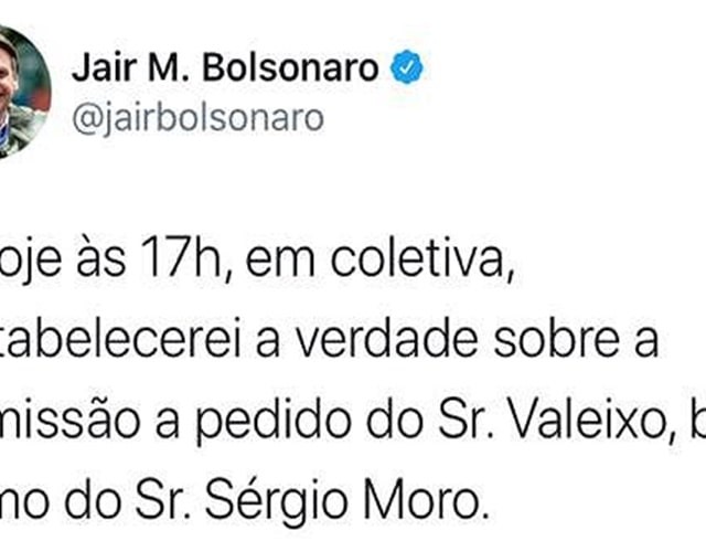 – Hoje às 17h, em coletiva, restabelecerei a verdade sobre a demissão a pedido do Sr. Valeixo, bem como do Sr. Sérgio Moro.