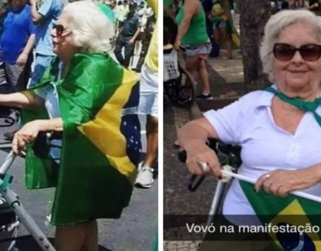 No último domingo (26), durante os atos pró-governo que ocorreram pelo país, o presidente Jair Bolsonaro publicou em seu Instagram uma foto de uma senhora vestindo verde e amarelo, enrolada em uma bandeira do Brasil, se locomovendo com a ajuda de um andador durante manifestação.