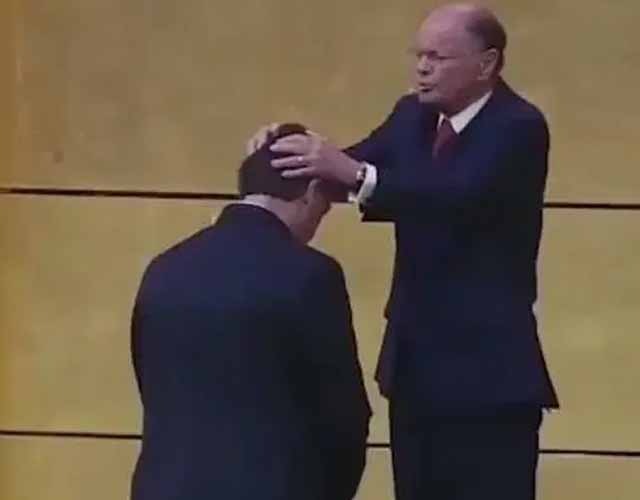 A pedido do bispo, Bolsonaro se ajoelhou diante do altar e de costas para os fiéis. Macedo, então, começou contando que, no passado, ele convidou para ir à igreja um outro candidato presidencial, que acabou virando presidente, mas que não foi possível levá-lo. O bispo não especificou a quem ele estava se referindo.