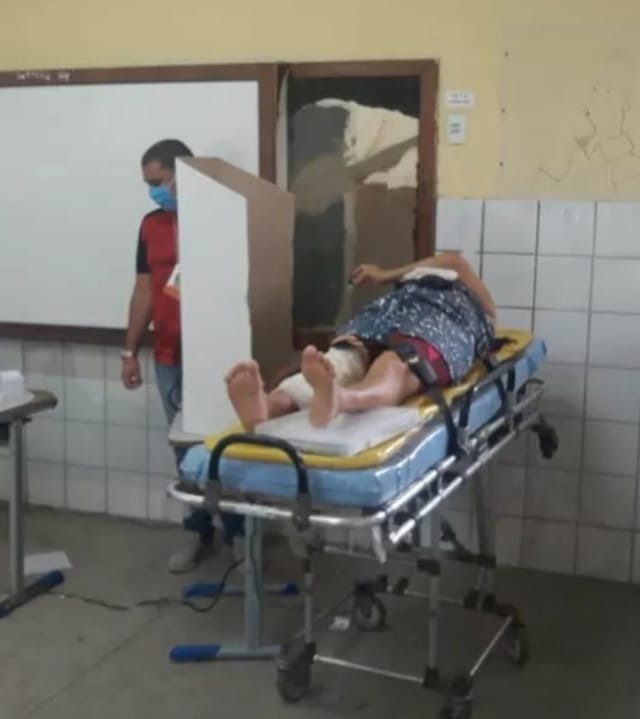 Durante as votações deste domingo (15), uma mulher teve que ir à urna carregada em uma maca, por uma equipe do Serviço de Atendimento Móvel de Urgência (Samu).