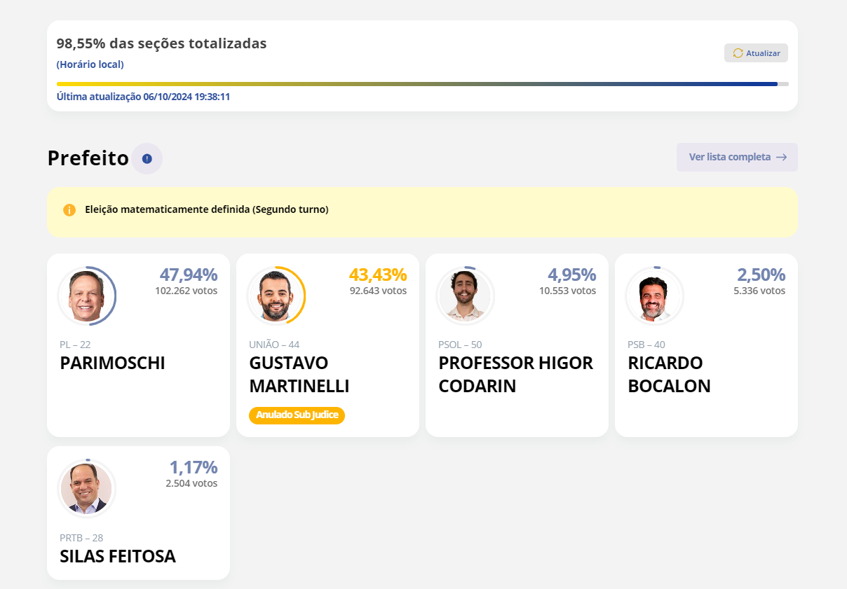 Com mais de 98% das apurações dos votos, as urnas eletrônicas decidiram que haverá um segundo turno entre José Antonio Parimoschi (PL) e Gustavo Martinelli (UNIÃO) pela Prefeitura de Jundiaí.