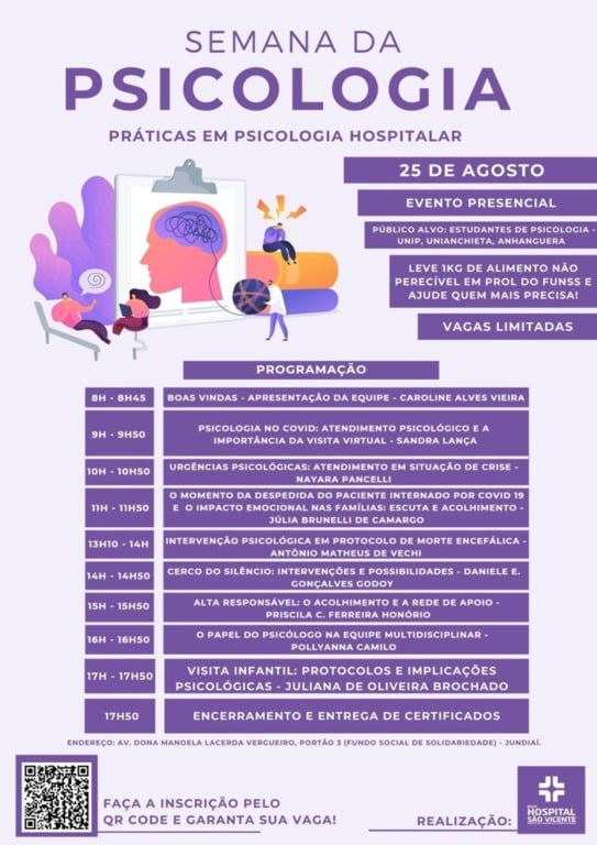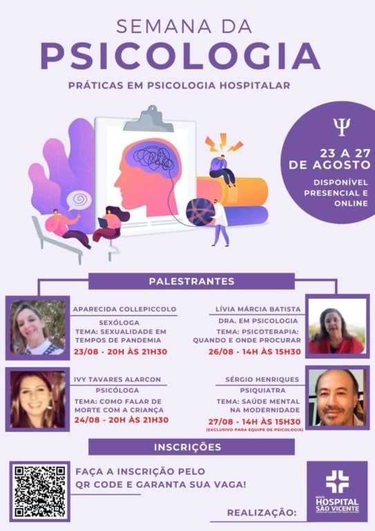 A equipe de psicologia do HSV trará abordagens distintas, e a semana contará com duas programações, uma para os colaboradores da instituição e outra para os alunos de psicologia da Universidade Paulista (UNIP), UniAnchieta e Faculdade Anhanguera. Serão oferecidas 80 vagas para a participação.