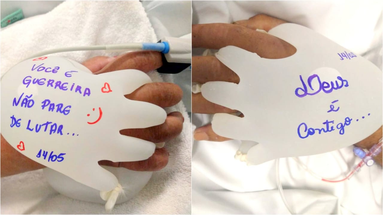 A equipe hospitalar ainda escreve frases motivacionais nas luvas, para dar mais confiança e conforto aos pacientes, como “Você é guerreira, não pare de lutar”, “Não desista, seja forte” e “Tudo vai ficar bem”.