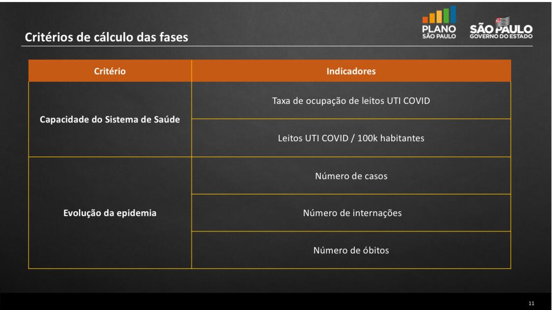 Esses indicadores são avaliados junto com dados de mortes, casos e internações por Covid-19 para determinar a fase em que se encontra cada região. O governo não revelou, no entanto, qual é o peso dado para cada indicador na definição das fases por região.