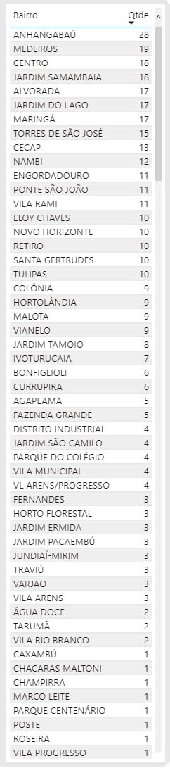 Ainda de acordo com o levantamento, os bairros Anhangabaú, Medeiros, Centro, Jardim Samambaia, Alvorada, Jardim do Lago e Maringá têm o maior número de casos confirmados.