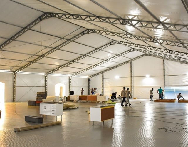 Em menos de uma semana, a equipe da Secretaria de Infraestrutura e Serviços Públicos já levantou toda a estrutura da tenda hospitalar, efetuou a instalação das luminárias, carpete e toda a estrutura hidráulica do local.