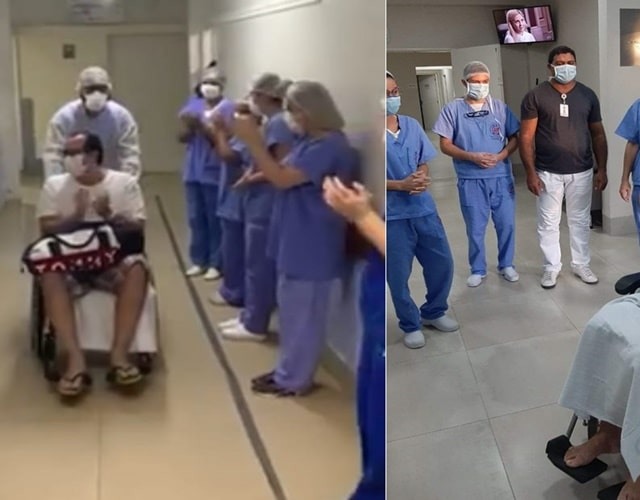Vídeos compartilhados nas redes sociais mostram o momento em que dois pacientes que tiveram coronavírus são aplaudidos por equipes de saúde ao receberem alta dos hospitais onde estavam internados.
