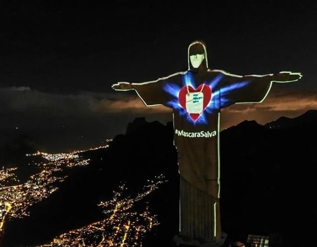 Na noite de domingo (3), o Cristo Redentor apareceu “usando” máscara de proteção. A projeção foi realizada das 19h às 22h, e é uma forma de conscientizar a população a se prevenir do novo coronavírus.