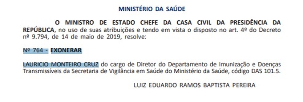 Nesta quinta-feira (8), foi publicada no Diário da União a exoneração do diretor de Imunização e Doenças Transmissíveis da Secretaria de Vigilância em Saúde do Ministério da Saúde, Lauricio Monteiro Cruz. De acordo com a acusação do Governo Federal, Cruz havia permitido que um reverendo e a entidade que ele presidia negociassem 400 milhões de doses da vacina contra Covid19, AstraZeneca, com a empresa americana Davati Medical Supply, em nome do governo brasileiro.
