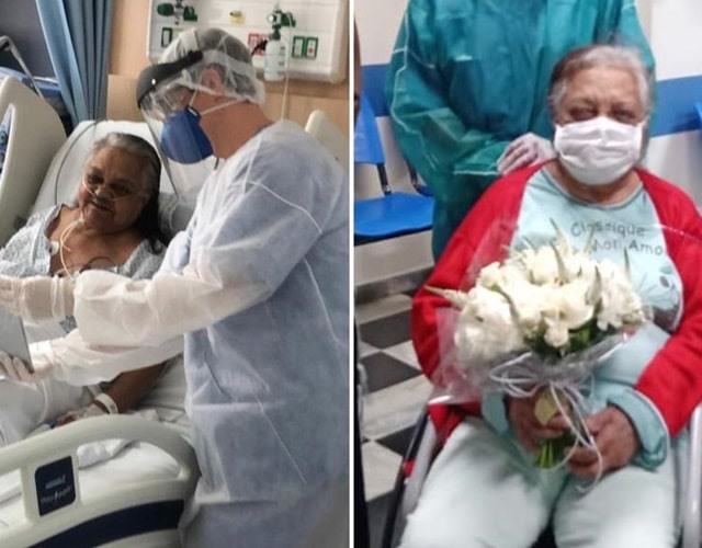 Ao deixar o hospital, ela recebeu flores e carinho da equipe médica.