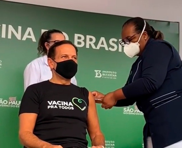 O governador de São Paulo, João Doria (PSDB), recebeu a primeira dose da vacina Coronavac na tarde desta sexta-feira (8), no bairro Pinheiros, em São Paulo. A aplicação foi feita pela primeira brasileira imunizada contra o coronavírus, a enfermeira Mônica Calazans.