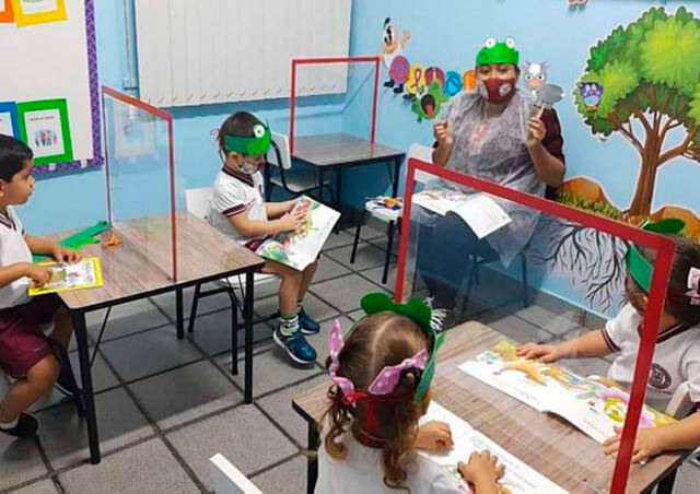 Em uma escola da capital, a administração optou por instalar barreiras acrílicas entre os estudantes.