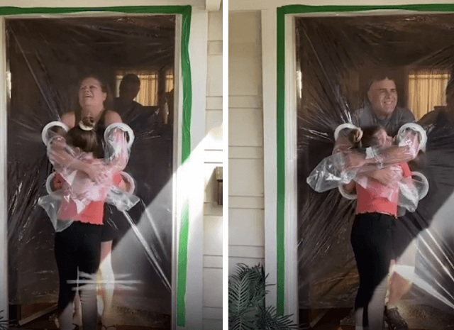 Usando uma cortina de chuveiro, saquinhos Ziploc, cola, fita adesiva e pratos descartáveis, o projeto não só deu certo, como permitiu um abraço entre ela e os avós.