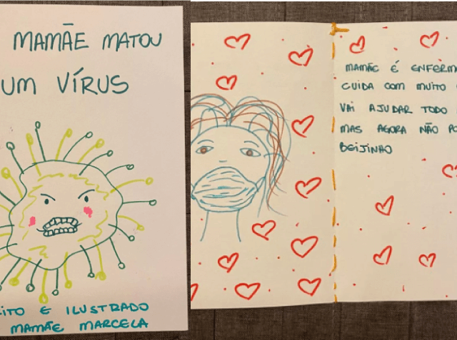 “Mamãe é enfermeira e cuida com muito carinho, vai ajudar todo mundo, mas agora não pode dar beijinho”, diz uma das páginas da história.