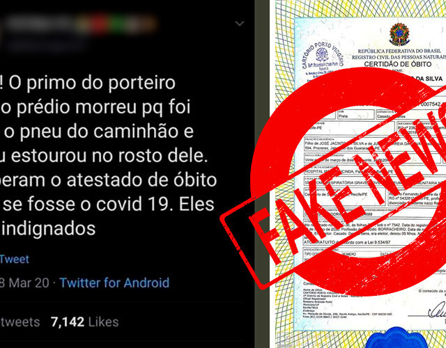 A guerra contra as fake News teve outra batalha entre ontem e hoje. Um suposto borracheiro, porteiro ou até mesmo um caminhoneiro teria morrido após a explosão de um pneu. Em seu atestado de óbito teria sido colocado como Covid-19. No entanto, a informação é falsa porque a cada instante um novo dado é acrescentado ou modificado. Essa falsa informação tenta descaracterizar o número de mortes pela doença no Brasil. Até ontem o número era de 114 mortos em todo o país.
