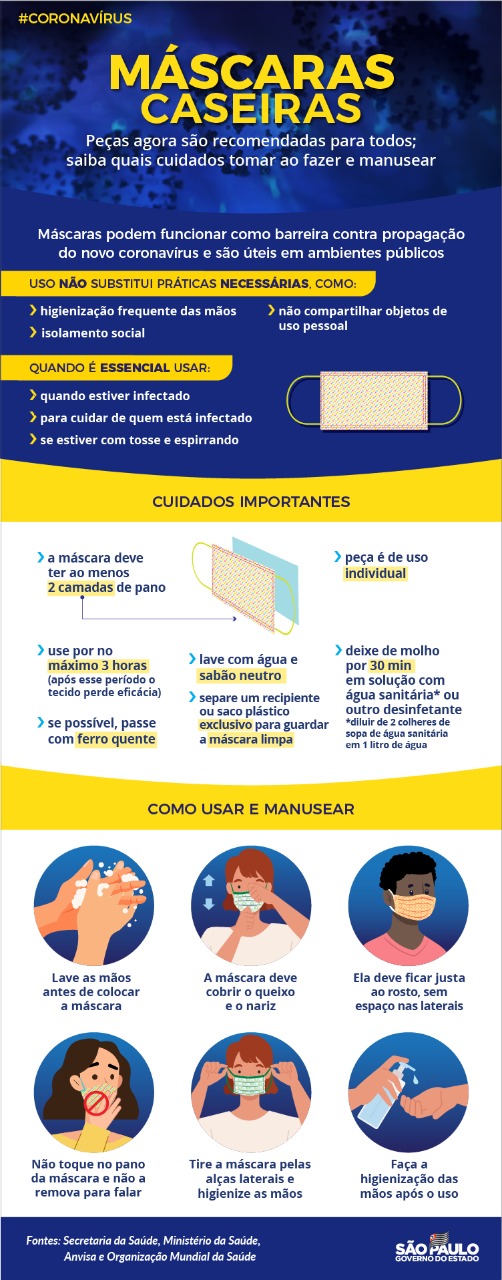 Os cidadãos de todo Estado poderão utilizar máscaras caseiras, confeccionadas com tecido, para atender à nova recomendação do Estado. A utilização da proteção facial, associada à orientação de isolamento social, tem objetivo de reduzir os índices de contaminação entre a população.