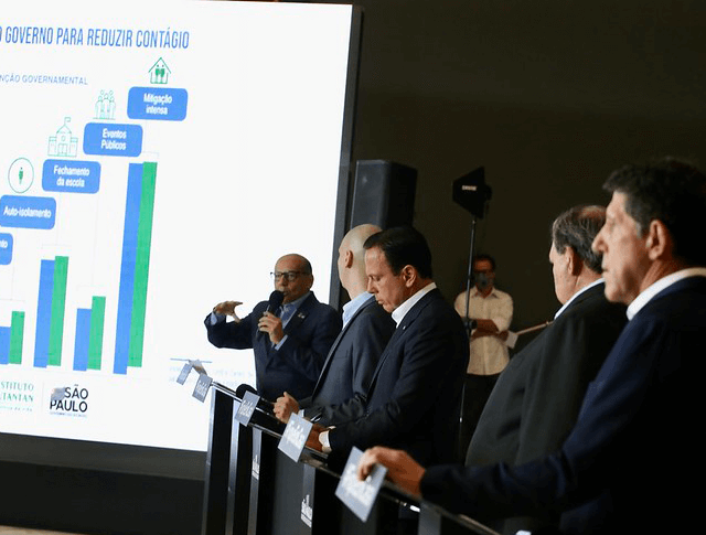 “Sem nenhuma medida [de isolamento] nós estaríamos lá no dia 13 de abril com quase 150 mil casos no estado de São Paulo. Com as medidas, nós vamos chegar nessa data com cerca de 20 a 25 mil casos. Essa é uma projeção pro dia 13, na semana que vem”, disse Dimas Covas, presidente do Instituto Butantan, que apresentou o estudo ao governador e imprensa.