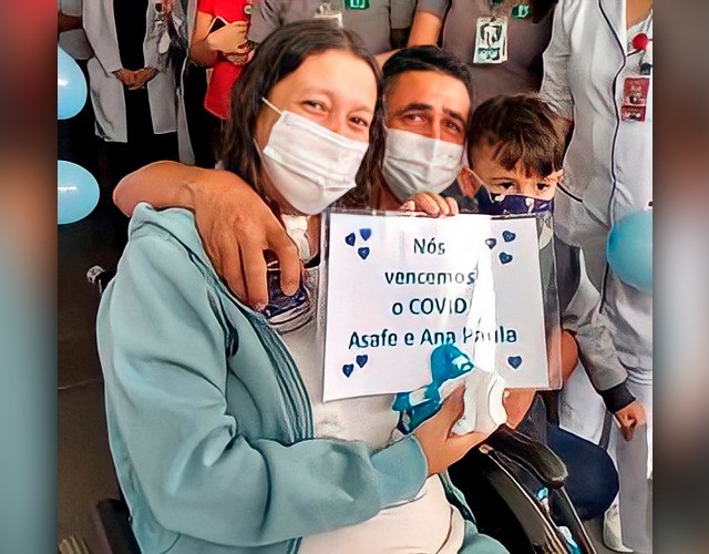 Ana Paula ficou intubada por quase um mês e teve de ser submetida a uma traqueostomia. Ela deu entrada no hospital quando estava com 18 semanas de gravidez. A alta médica foi celebrada não só pela família, mas também por toda a equipe do hospital.