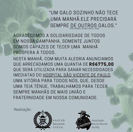 Por meio de nota de agradecimento, as instituições reforçaram a importância da união da comunidade em meio ao coronavírus. “Somente juntos somos capazes de tecer uma manhã próspera a todos”.