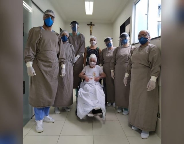 Ela tem Alzheimer e não precisou ir para o Centro de Tratamento e Terapia Intensivo (CTI). Ao sair da unidade, Carlinda recebeu o carinho dos funcionários do hospital.