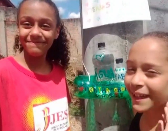 Pensando no bem-estar dos coletores de lixo do seu bairro Vale Ville, em Sorocaba (SP), as irmãs Hadassa e Nicole Silva, de 12 e 9 anos, respectivamente, montaram um suporte com água e sabão para os trabalhadores lavarem as mãos.