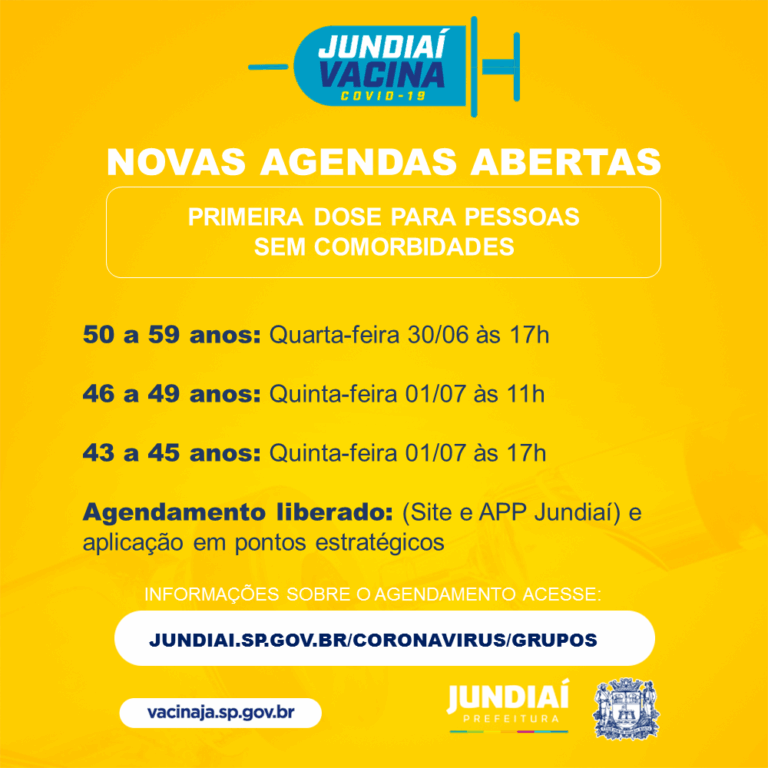 A Prefeitura de Jundiaí anunciou nesta quarta (30) a abertura de agendamento para a vacinação contra a Covid19. São três grupos, com idades entre 43 a 45 anos (quinta, dia 1º, às 17h), 46 a 49 anos (quinta, dia 1º, às 11h) e também de 50 a 59 anos (hoje, às 17h). O cadastro pode ser feito pelo site da Prefeitura ou pelo APP Jundiaí.