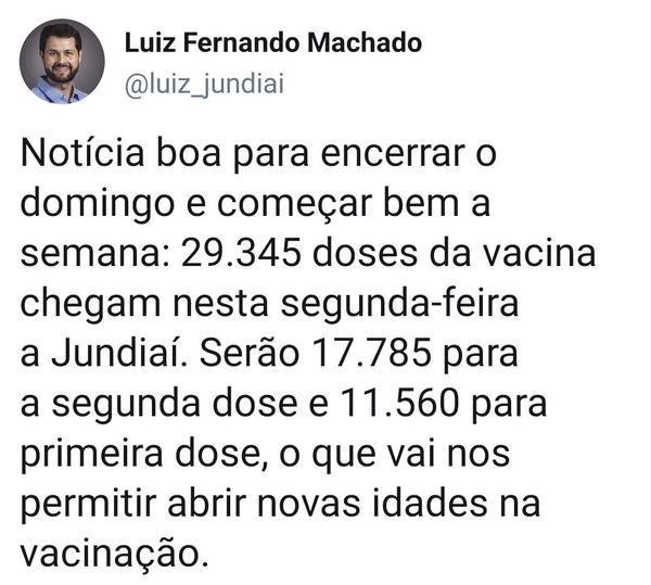 Na noite deste domingo (1°), o prefeito de Jundiaí, Luiz Fernando Machado, anunciou em suas redes sociais que Jundiaí recebeu novas doses de vacina contra a Covid19. Dessa forma, de acordo com ele, será possível “abrir novas idades na vacinação”.