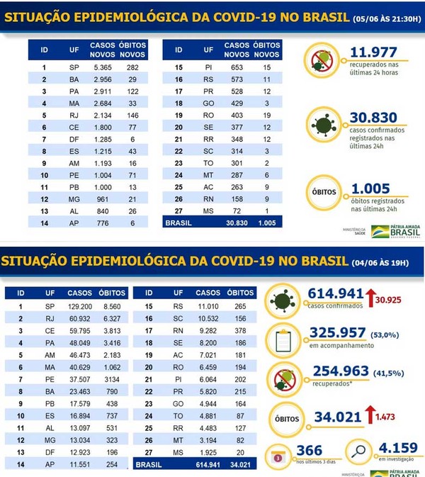 - 1.005 registros de mortes em 24 horas (com o acréscimo, vai a 35.026 o total de óbitos, que era de 34.021 na quinta)