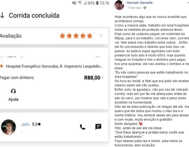“Enfim Julio, te agradeço, não por não ter cobrado a corrida, mas sim por ter me abençoado antes de sair do carro, por mostrar que vale a pena ainda acreditar na humanidade”, escreveu Hannah.
