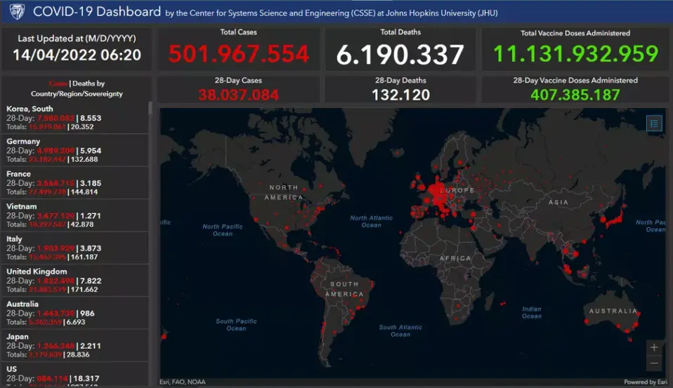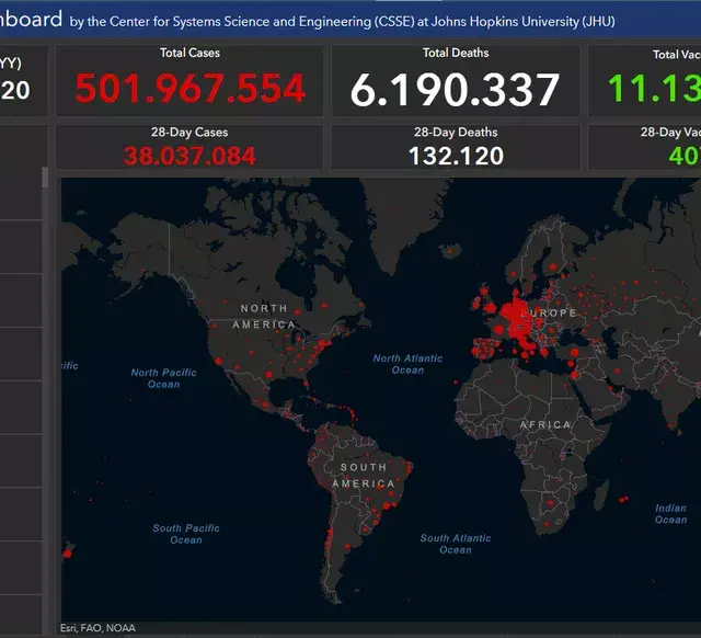 O mundo ultrapassou os 500 milhões de casos registrados de Covid-19, segundo levantamento da Universidade Johns Hopkins, que monitora os números desde o início da pandemia.esde o início da pandemia.